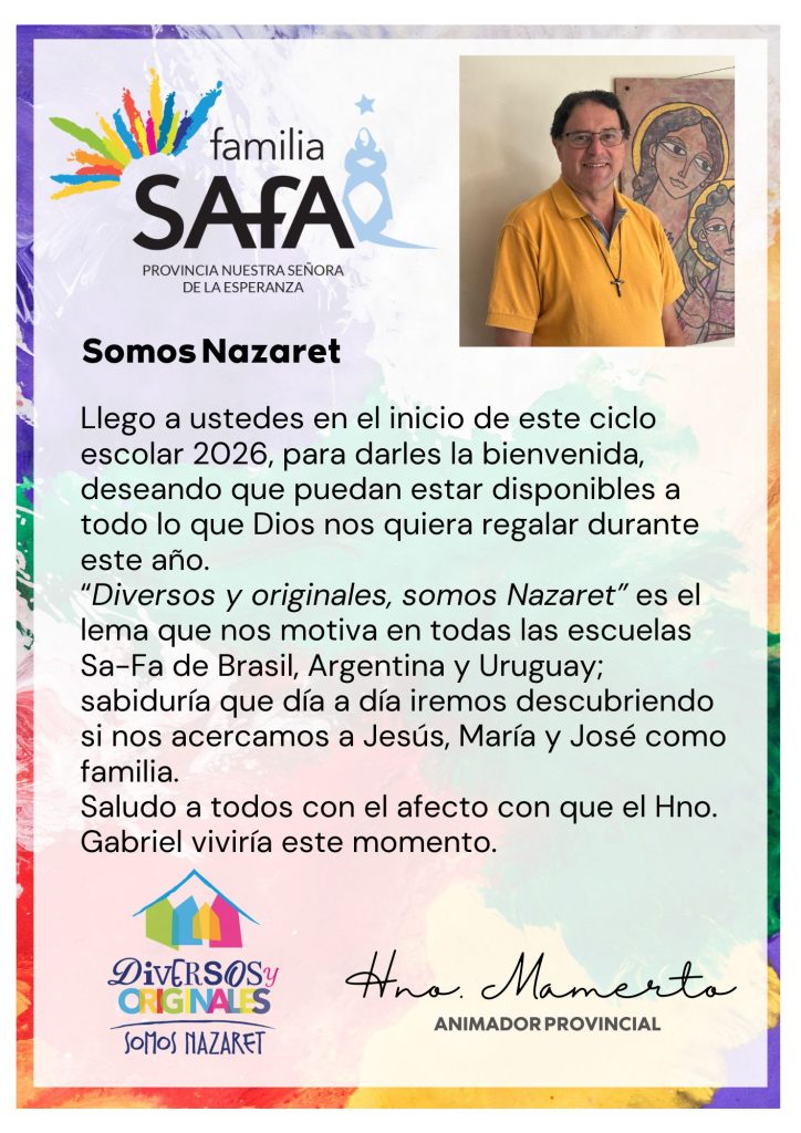 “Diversos y originales, somos Nazaret” es el lema que nos motiva en todas las escuelas Sa-Fa de Brasil, Argentina y Uruguay; sabiduría que día a día iremos descubriendo si nos acercamos a Jesús, María y José como familia.