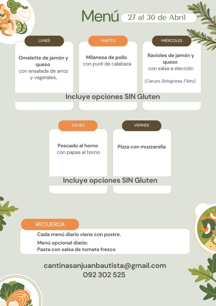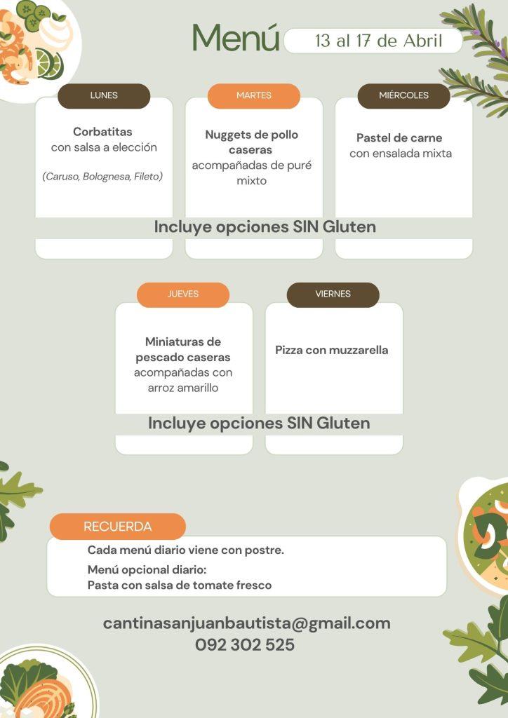 ✓ Menú semanal: nuestro menú es elaborado respetando los mayores estándares de calidad. Además, es elaborado en su totalidad dentro de las instalaciones de la cantina del colegio, lo cual garantiza una mayor inocuidad alimentaria y trazabilidad del alimento.