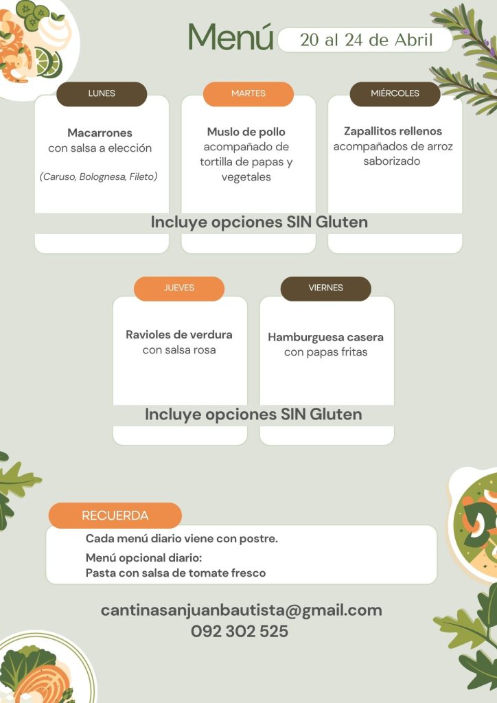 ✓ Solicitud de menú: directamente en cantina y/o a través del celular 092 302 525, enviando el comprobante de transferencia, nombre completo y clase.