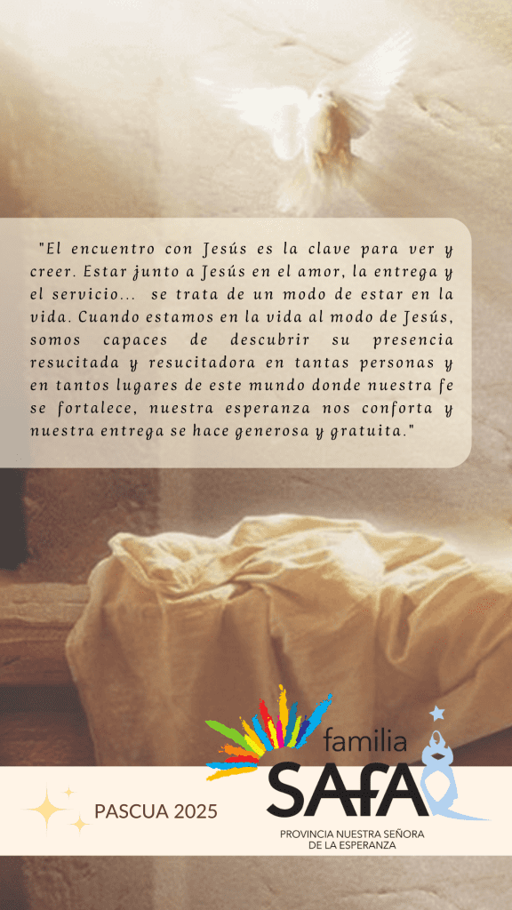 Que esta Pascua nos impulse a abrazar la vida, buscando caminos de cercanía con nuestros hermanos y nos anime a seguir siendo testigos alegres de Jesús resucitado. ¡¡Felices Pascuas!!